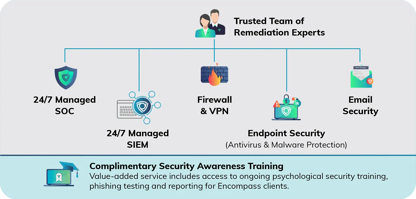 The Ostra Encompass comprehensive offering is tailored for SMBs and partners seeking a solution that addresses all their critical cybersecurity requirements. Ostra’s innovative layered security approach seamlessly integrates multiple Security Information and Event Management (SIEM) tools, complemented by continuous 24/7 monitoring from their cutting-edge Security Operations Center (SOC). Ostra Encompass goes above and beyond by incorporating essential components like Firewall/VPN, Endpoint Security/Antivirus, Malware Protection, Email Security, and continuous Security Awareness Training.