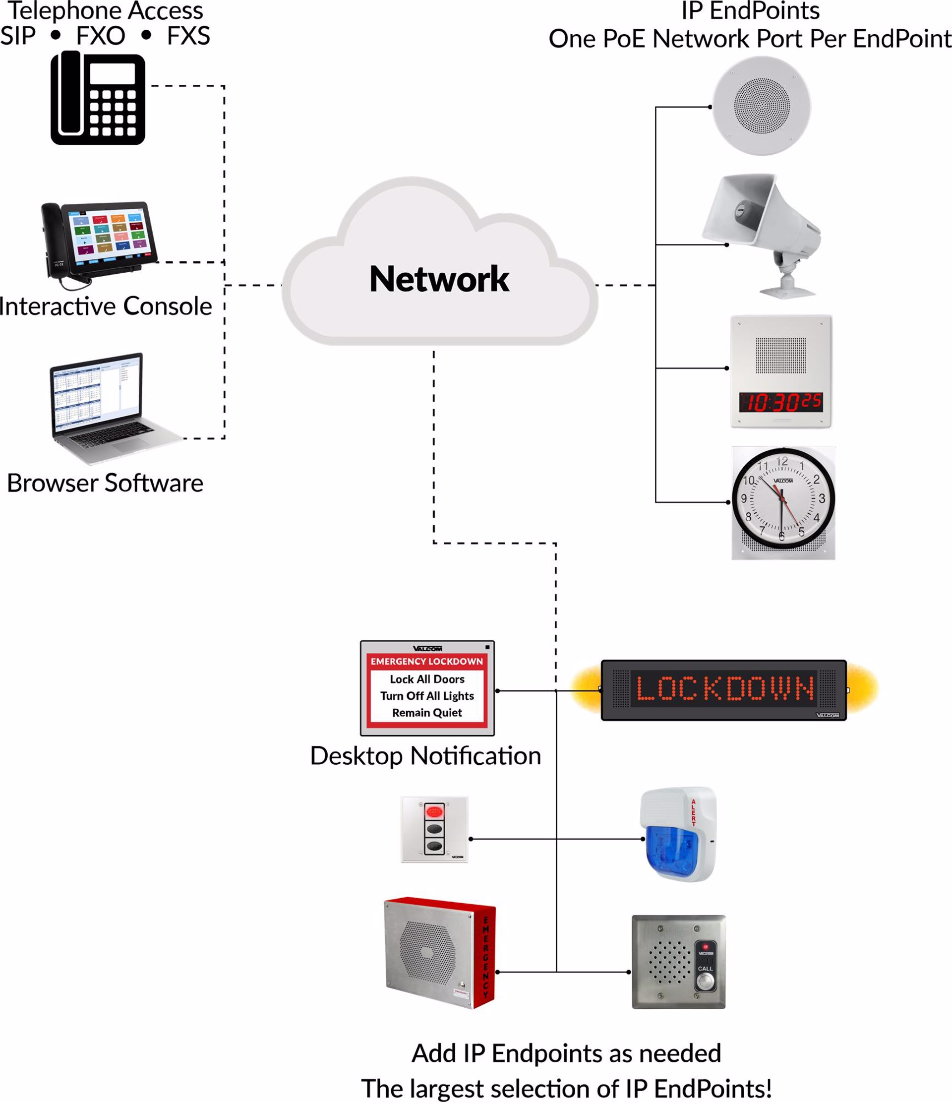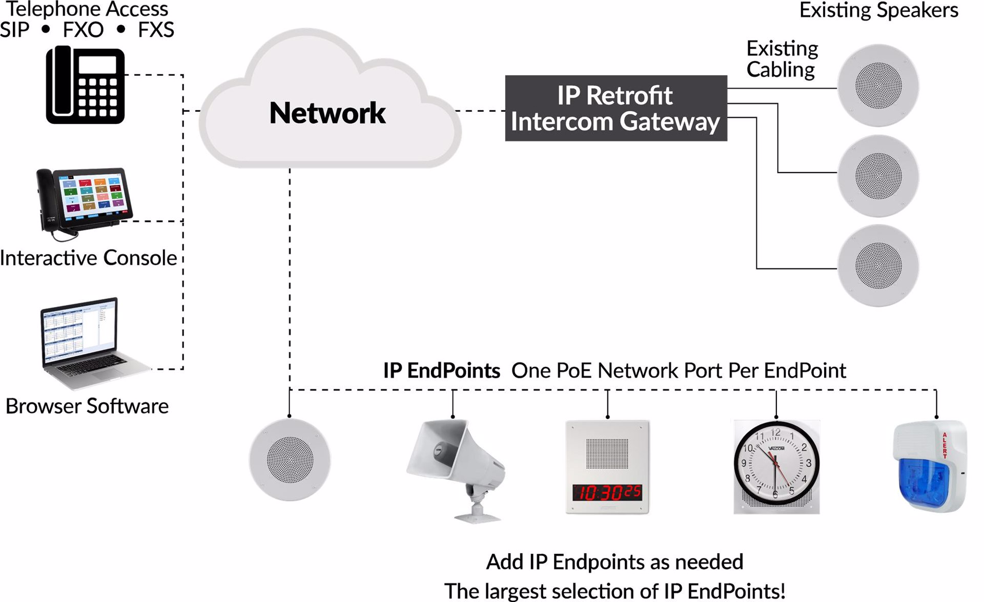 Modern and flexible, full IP general purpose paging systems can be easily installed and used with new or existing network infrastructures. With a simple plug-and-play setup, each endpoint, such as speakers and horns, can be connected to a PoE network switch, which provides both communications and power through a single port. The system is 100% software-controlled and managed, allowing for easy adjustments to be made with just a few clicks, including changes to speaker volume levels, zoning, and all-call page broadcast. Access to the system can be achieved through stand-alone phones, microphones, IP Interactive Consoles, FXO, FXS, and SIP.